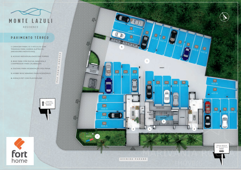 O prédio tem garagem para 2 e 3 veículos com tomadas para carros elétricos e duchas pós praia.